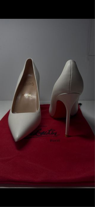 Elegantes tacones Christian Louboutin. Forro: piel Suela: plantilla de piel, suela roja distintiva de piel Color: blanco Puntera: en punta Hecho en Italia Incluye: bolsa protectora, caja para zapatos Estos zapatos son talla 39, han intentado ser usados en dos ocasiones pero yo que no estoy acostumbrada a usar este tipo de calzado se me ha hecho incómodo. La piel está muy cuidada y no tienen ni un solo defecto. Las costuras están en perfecto estado y la suela ha sido usada con un protector de plástico por lo que no ha sido rozada ni arañada. El tacón es de 10 - Color blanco. - Detalle de suela roja icónica. - Diseño de punta fina.