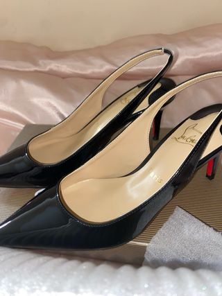 Elegantes zapatos de tacón destalonados. - Acabado brillante. - Punta fina. - Tira ajustable en el talón. - Detalle de la marca en la plantilla. - Suela roja icónica.
