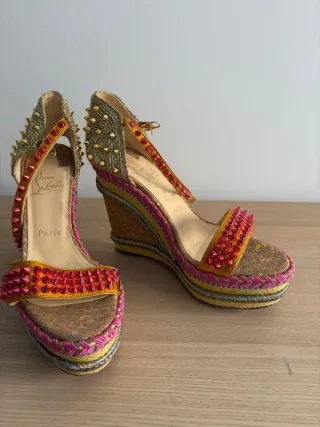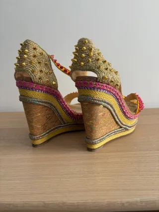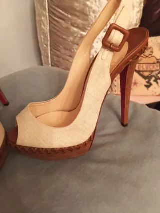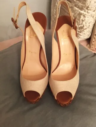 Vendo sandalias originales Christian Louboutin, modelo de cuña con acabado en ante claro y detalles decorativos en la plataforma. ✔️ Talla: 38 ✔️ Estado: Muy buen estado / poco uso ✔️ Color: Beige / nude ✔️ Incluye: Solo zapatos (sin caja original) ✔️ Autenticidad garantizada Zapatos muy elegantes y cómodos, ideales para eventos, verano o ocasiones especiales. Se venden por no usarse. 📦 Envío rápido o entrega en mano según zona. No dudes en escribirme para más fotos o información.