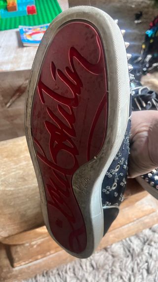 Zapatos de diseñador Christian Louboutin. - Diseño con tachuelas plateadas. - Combinación de tela vaquera y detalles en rojo. - Suela roja icónica.