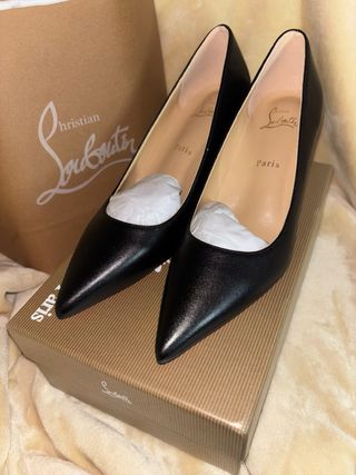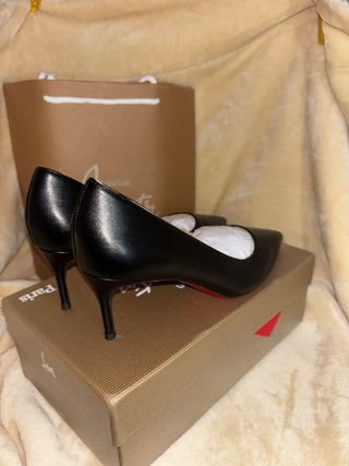 Elegante zapato de tacón Christian Louboutin, modelo Kate. - Diseño clásico y sofisticado. - Acabado en piel. - Tacón fino 10 cm y estilizado. - Talla 38 Ojo!!! Este modelo de la marca da poca talla. Son un regalo y no puedo cambiarlos, solo escribir interesados , no se hacen envíos y no se hacen cambios una vez entregados. Están completamente nuevos sin un solo uso, incluso aun mantienen la tela de protección de plástico de la suela.