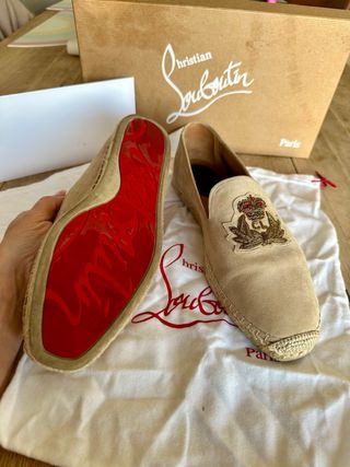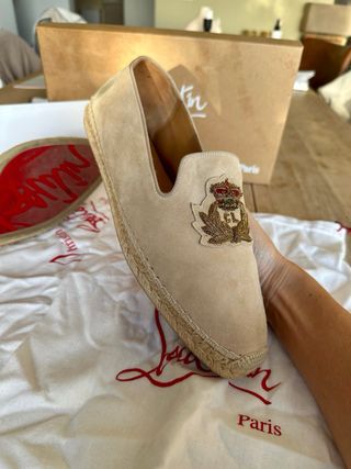 Alpargatas originales Christian Louboutin modelo Nanou Orlato para hombre, en color beige/nude, con factura, caja original y bolsa guardapolvo, talla 42. Usados aproximadamente 2–3 veces – zapatos en estado excelente, como nuevos. El zapato derecho tiene una pequeña mancha de suciedad en la parte trasera derecha (ver foto). SKU: 3615482879227
