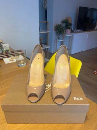 Elegantes zapatos de tacón Christian Louboutin en color beige. - Diseño peep toe. - Tacón de aguja. - Ligero rasguño en el tacon - Los vendo por falta de uso - Con su caja, bolsa guardapolvo y bolsita con tapas