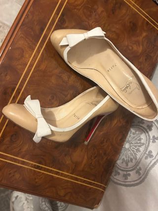 Elegantes zapatos de tacón Christian Louboutin. - Color beige con detalle de lazo blanco. - Suela roja icónica. - Tacón de aguja.