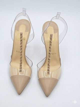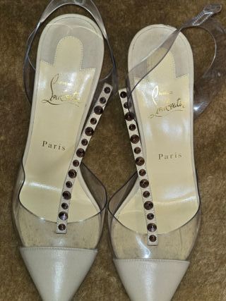 Elegantes zapatos Christian Louboutin Nosy Spikes. Falta la tira que va al tobillo - Diseño con detalles de tachuelas doradas. - Materiales transparentes y acabado beige. - Talla 39.5.