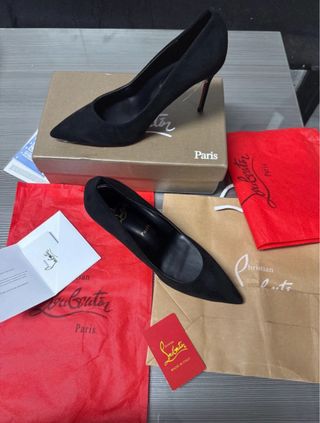 Elegantes zapatos de tacón de ante. - Diseño de punta fina. - Tacón de aguja. - Suela roja icónica. - Incluye caja y bolsas de la marca.