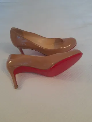 Preciosos zapatos de tacón color beige en charol y suela roja, réplica de los clásicos Loboutin. Han sido puestos en dos ocasiones, se puede apreciar por el estado de la suela, las tapas y el zapato en general. El izquierdo tiene una pequeña manchita en la punta ( foto) que no sé muy bien lo que es yno he conseguido quitar, no he querido echarle productos ni nada por si acaso, de ahí su precio. Talla 37.