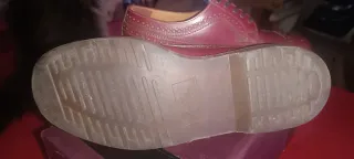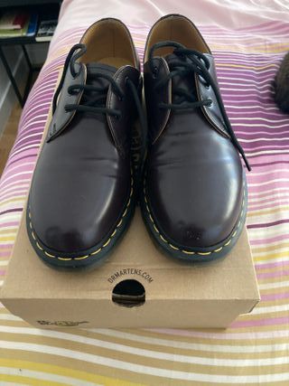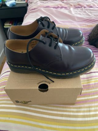 Zapatos de piel en color burdeos, estilo Dr. Martens, muy cómodos y resistentes. Presentan signos normales de uso, pero están en buen estado general. Ideales para uso diario o looks alternativos. Suela gruesa y duradera. - Cierre con cordones negros. - Suela de goma. - Costuras amarillas características.