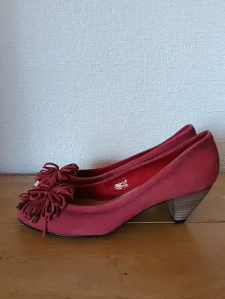Elegantes zapatos de salón de ante en color rojo. Tacon de 8,5 cm Y la talla corresponde a 38/38,5 - Tacón fino y estilizado. - Punta afilada. - Detalle de logo en la plantilla. Lo tengo en color amarillo mostaza tambien . Dos usos en un evento. Son comodisimos,pero tengo fastidiada la cadera y no puedo usar tacon