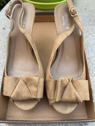 Sandalias de Marypaz, color tendencia Marrón precioso. El Tacón parece de madera que es el toque llamativo del zapatos. Usado una vez. Medidas zapato: * Largo: 22 cm aproximadamente * Ancho: 8,5 cm aproximadamente ( para pie fino) Medidas Tacón: * Tacón: 13,5 cm * Plataforma delantera: 3,5 cm