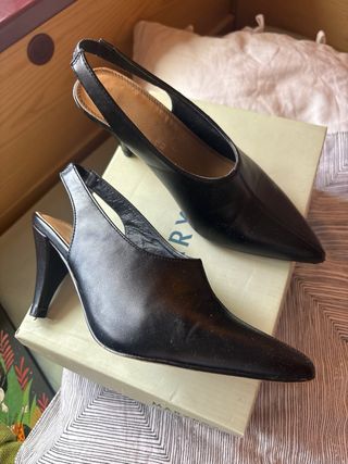 Zapatos de tacón Marypaz en color negro, talla 38. Tacón fino de aproximadamente 9 cm que estiliza mucho la pierna. Usados solo un par de veces, están como nuevos, muy bien cuidados y sin apenas marcas de uso.