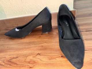 Preciosos zapatos de salón negros, talla 39. Son de tacón medio/bajo y punta fina. Ideales para cualquier ocasión. - Material: ante - Tacón: bloque - Estilo: clásico - Precio original: 39,99€ - Uso: usado para 3 ocasiones especiales. - Escucho ofertas