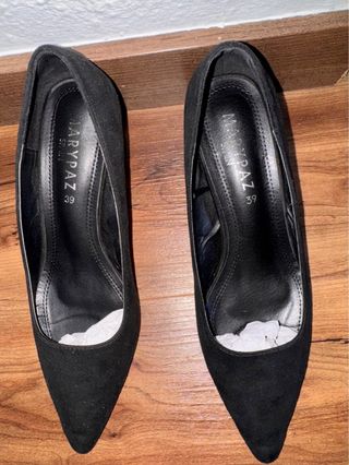 Preciosos zapatos de tacón de la marca MARYPAZ. Son de color negro y talla 39. Estan usados solo para una sesion fotografica sin uso en la calle - Material: ante. - Tacón fino. - Punta estrecha.