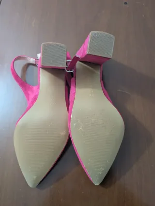 Elegantes zapatos de tacón con diseño destalonado. Como se puede ver en las fotos, están sin estrenar. Vienen con tapas de repuesto para el tacón. - Material exterior de ante. - Punta fina. - Tira ajustable en el tobillo. - Están sin estrenar. Talla 40 pero calzan justos. Si calzas un 39 también te pueden servir ¡¡El precio no es negociable!!