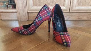 En muy buen estado. Usados para un bautizo. Muy cómodos. Tacón de 10 cm. Tela con estampado escocés (tartán) de la marca Marypaz
