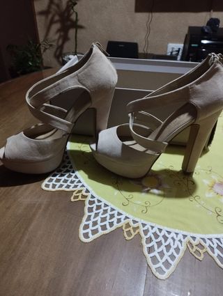 zapatos de señora color beige de ante de plataforma y de tacón alto la plataforma mide 3 centímetros y el tacón con la suela 14 centímetros tiene unas tiras alante para que no se mueva el pie al andar y este más sujeto atrás tiene cremallera de la marca Mari Paz el número 38 están como podéis ver completamente nuevos puesto solamente una vez la suela está impecable su precio son 7€