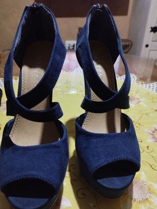 zapatos de tacón y plataforma color azul marino de ante número 38 y de la marca Marypaz el tacón mide 14 cm con la suela y la plataforma tres centímetros lleva unas tiras alante para que vaya más sujeto el pie y no se deslice atrás lleva una cremallera están completamente nuevos usados solo una vez como podéis ver en la suela y en el tacón su precio son ocho euros