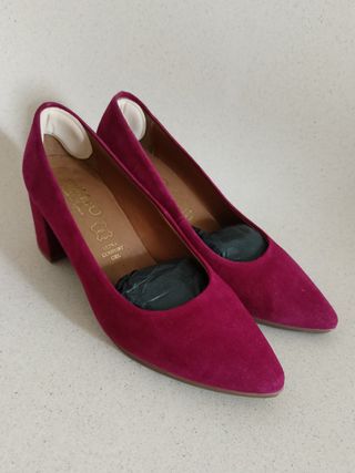 Zapatos de tacón medio fabricados en piel de ante de máxima calidad en color Fucsia.Disponen de la tecnología de plantilla Ultra Confort Gel que amortigua el impacto de los pasos sobre la planta del pie. Zapatos de tacón medio de 6,5 cm. Altura del piso: 1 cm. Material exterior del zapato: Piel de ante. Material interior: Textil. Piel. Tecnología del Confort: plantilla de Piel Gota Ultra Confort Gel transpirable. Suela: Goma antideslizante y ultra flexible. Usados sólo una vez. Equivocación al elegir talla. Talla 38.