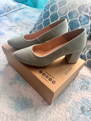 Elegantes zapatos de salón en color verde, perfectos para cualquier ocasión. Solo se han usado una vez, están como nuevos. - Tacón cómodo y estable. - Diseño clásico y versátil.