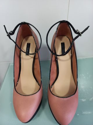 Zapatos de vestir. Color nude con tiras negras. Puntera abierta.