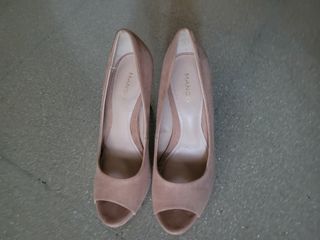 Zapato peep toe Zara, talla 39. Como nuevo. Color camel clarito. Neutro, nude. Tipo ante. Están usados pero como nuevos. En las fotos se puede apreciar, pero al ser ante siempre es difícil fotografiar. Son muy cómodos, tienen una pequeña plataforma que te aísla la pisada. Son muy cómodos. La hebilla y el tacón imitan madera. Con vaqueros quedan monísimos. Perfectos para salir y eventos; bautizo, comunión, boda, etc. También los tengo en negro. Estoy subiendo cosas que no uso por mudanza. Se hacen lotes. Si necesitas más fotos, contáctame y las subo. Casi todo a 2€, 5€ y 7€