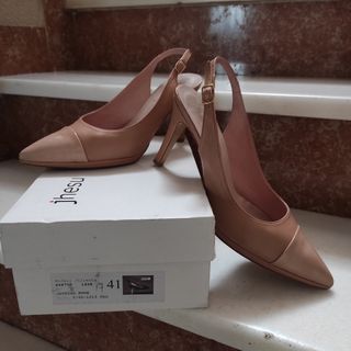 Zapatos de tacón, de piel, color nude, n⁰41. Usados para dos bodas. Prácticamente nuevos. Incluye protector de tacón para césped. Conservados en su caja original.