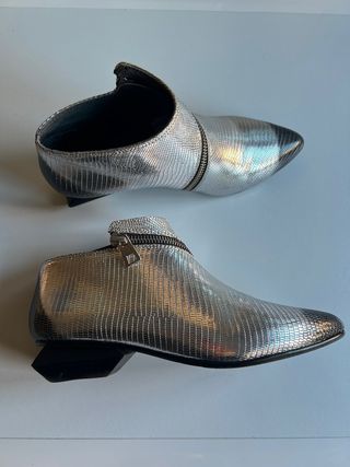 Botines de piel de diseño United nude costaron 150€ - Acabado metalizado plateado. - Detalle de cremallera. - Tacón con forma geométrica.