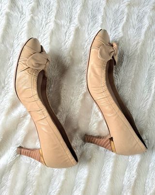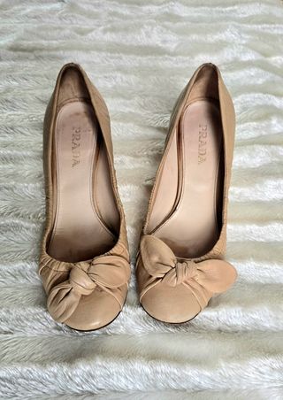 Elegantes zapatos PRADA de salón. T.38. Comodísimosm Tacón de 6,5 cm. y TODO PIEL. Color nude. Diseño sofisticado y femenino, con detalle de lazo en la punta. Tacón recién reparado, con detalles dorados. Usados, pero en muy buen estado.