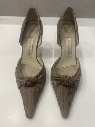 Preciosos zapatos de tacón de la marca Nuria Cobo, en color beige nude, abiertos por detras. Son de ante y tienen un lazo en la puntera. Ideales para una ocasión especial. Muy comodos, plantilla interior de gel y exterior de goma. Usados en una sola ocasion para un evento. - Tacón alto de 10 cms y plataforma de 1 cm. - Diseño elegante. - Material: ante.