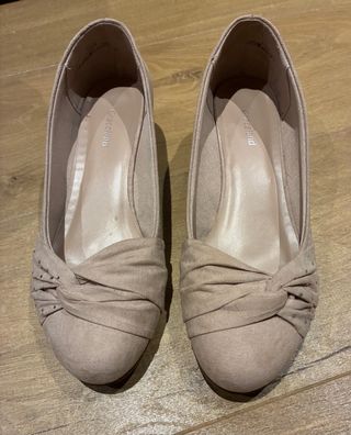 Elegantes zapatos de tacón medio, descendente y muy cómodo, de 3 cm, de Graceland. Color rosa palo o beige rosado. Perfectos para añadir un toque sofisticado a tu atuendo. Muy originales y bonitos. Poco uso. Como nuevos. Vendo por mudanza. - Diseño con nudo decorativo en la pala. - Pequeños detalles de pedrería.