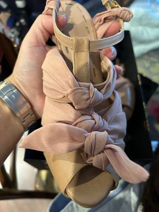 Elegante zapato de cuña con un diseño moderno. - Material exterior de ante. - Tiras delanteras con detalle de nudos. - Correa ajustable al tobillo con hebilla metálica. - Cuña de corcho. - Tacón de cuña.