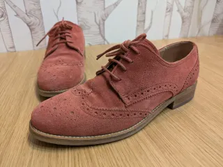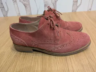 Elegantes zapatos planos de ante en color rosa. Talla 36 - Diseño tipo Oxford con picado decorativo. - Cierre con cordones. - Suela de goma. Muy poco uso.