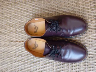 Zapatos de cuero estilo Oxford de Dr. Martens. - Color morado oscuro. - Cordones negros. - Suela con costura amarilla característica.