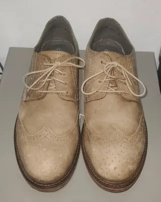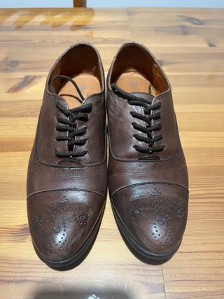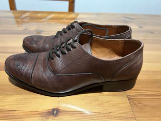 Zapatos estilo oxford/brogue de serraje marrón en buen estado. Fabricados en España. Suela robusta con buena tracción y tacón bajo cómodo para uso diario. Talla 37. Muy combinables y perfectos para otoño/invierno. Se entregan limpios y listos para usar.