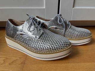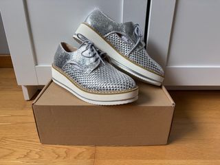 Zapatos de estilo Oxford con plataforma y diseño tejido. - Acabado metalizado plateado. - Detalle de tejido en la parte delantera. - Plataforma con detalles en contraste. A estrenar, con su caja y su funda. Se pidieron confundidos y no hubo manera de devolverlos.