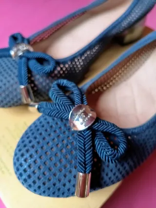 Si compras 2 pares hago un 10% sobre precio total, 3 pares un 20%, 4 pares 30% etc. siempre que todos los precios sean similares. Elegantes zapatos planos para mujer. - Color azul. - Diseño con perforaciones. - Detalle de lazo y detalle metálico en la puntera.