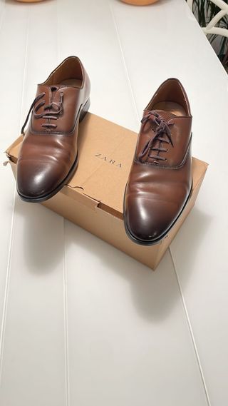 Elegantes zapatos de vestir de Zara en color marrón. Perfectos para ocasiones formales o para dar un toque sofisticado a tu atuendo. - Diseño clásico con cordones. - Acabado con microperforaciones decorativas. - Suela de goma para mayor comodidad.