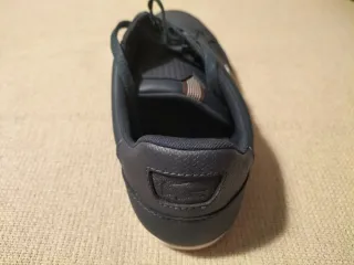 Zapatos de la marca Lacoste en color azul marino, aún con sus etiquetas. - Diseño deportivo y casual. - Detalle de franjas laterales. - Logo del cocodrilo visible.