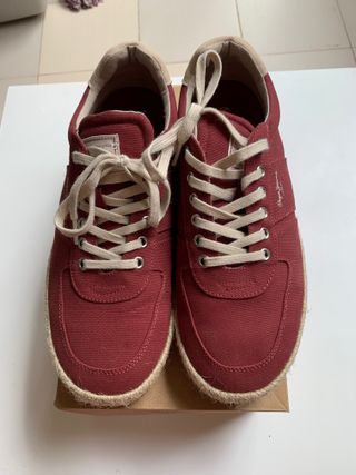 Estas zapatillas son de vestir y están prácticamente nuevas, cinco salidas con ellas para más exactitud. La talla es la 41, y el material es piel sintética de color azul marino y marrón claro (con algunos detalles rojo oscuro y blanco).