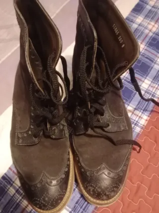 Zapatos de ante en color marrón. - Diseño tipo botín. - Cordones a tono. - Interior a cuadros.