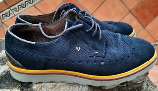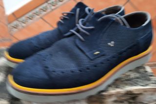 Zapatos MARTINELLI de cordones, de piel de ante azul marino y detalles en la suela en color amarillo Talla 42, muy cómodos. Buen estado, muy poco uso.