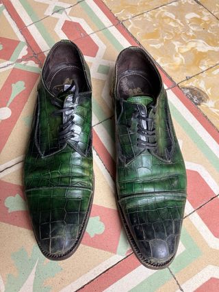 Elegantes zapatos de vestir con acabado de piel de cocodrilo en tono verde. - Diseño de piel texturizada. - Cordones negros. - Puntera reforzada.