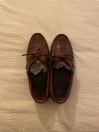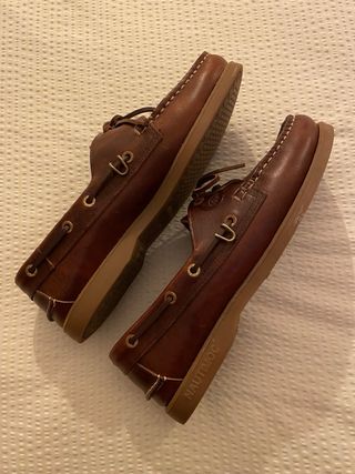 Náuticos de piel Pielsa en color marrón nuevos. - Material exterior de piel. - Detalle de costuras blancas. - Cordones marrones. - Suela de goma. Se los han regalado a mi marido y ha perdido el ticket. Solo los ha usado en una ocasión y como tiene el pie muy ancho, le aprietan.
