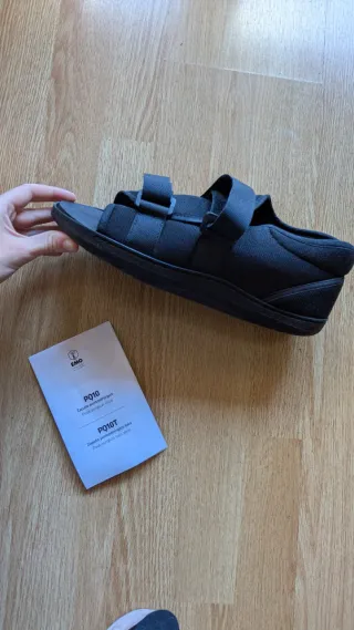 Zapato postquirúrgico de la marca EMO, modelo PQ10. - Cierre con velcro. - Suela antideslizante. Talla XL, se ha usado para una persona con talla 44, pero vale para más tallas. Para más info y medidas preguntar sin problema