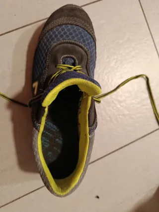 Zapatos de trabajo en buen estado, con muy poco uso. - Diseño en malla azul y detalles grises. - Cordones amarillos. - Logo amarillo en el lateral.