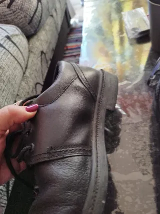 Calzado de seguridad de cuero negro. - Con cordones y cierre de velcro y hebilla. - Puntera reforzada. - Suela antideslizante.