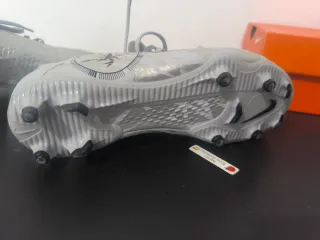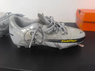 Zapatos de fútbol Nike Phantom con un diseño llamativo. Están perfectas - Color plateado y blanco. - Detalle gráfico en el lateral. - Marca Phantom en amarillo.