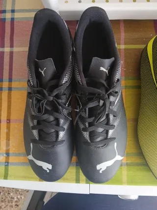 Zapatos de fútbol Puma en color negro con detalles blancos. Perfectos para jugar en césped. - Diseño deportivo. - Cierre con cordones.