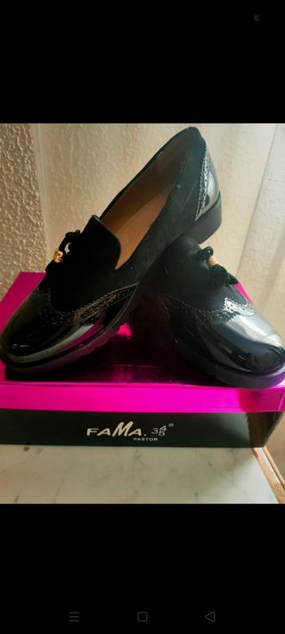 Zapato plano color negro, combinación de materia tipo ante y charol. muy cómodos Talla 40