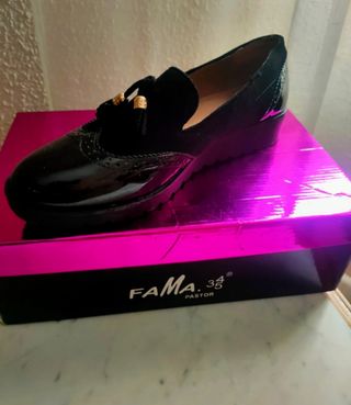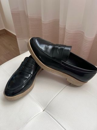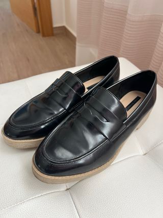 Elegantes mocasines de charol negro. - Diseño clásico con antifaz. - Suela gruesa y cómoda. - Poco uso, como nuevos.